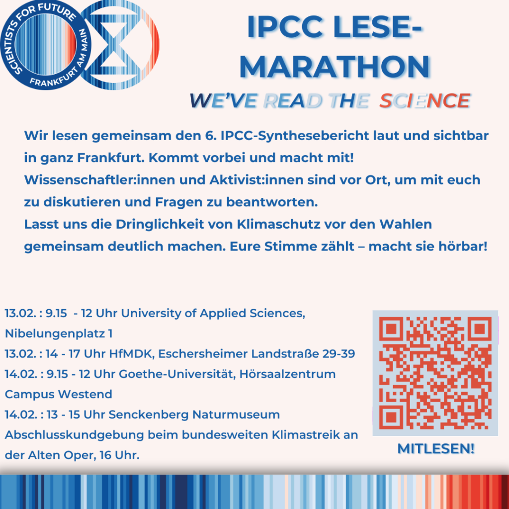Frankfurt am Main, 30. Januar 2025 – Scientist4Future und Scientist Rebellion laden zu einer eine öffentlichen Marathon-Lesung des vollständigen 6. Syntheseberichts des Weltklimarates (IPCC) in englischer und deutscher Sprache am 13. und 14. Februar 2025 in Frankfurt ein. Das Reading wird an vier unterschiedlichen Standorten stattfinden und endet auf dem für Freitag, den 14.2., angekündigten Klimastreik am Opernplatz.